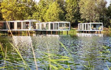 Unique 2-person lodge hanging above the water, with luxury kitchen, air conditioning and a stunning terrace overlooking the lake.