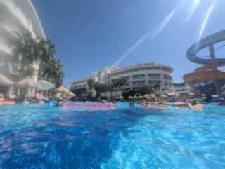 Weil im Urlaub endlich mal Zeit für Erholung ist, bietet sich die Nutzung des Wellness & Spa Centers an. Dort locken Sauna, Dampfbad, ein beheiztes Schwimmbecken, Massagen und Anwendungen. Im Fitnessstudio haben die Hotelkunden die Möglichkeit, auch an der Türkischen Riviera mit ihrem Sportprogramm fortzufahren. Wer im Hotel Alba Queen lieber ohne Geräte trainiert, nimmt an der Gymnastik, dem Zumba oder der Wassergymnastik teil. Auf Zielgenauigkeit kommt es beim Luftgewehrschießen, Darts, Boccia, Billard und Minigolf an. Viele Hotelkunden wird es zudem freuen, dass sie mehrere Bowlingbahnen nutzen können. Abends kommen die Erwachsenen bei Aufführungen im Amphitheater auf ihre Kosten und zwischen 23 und 3 Uhr können sie in der Hoteldisko das Tanzbein schwingen. Für die Kleinen ist auf dem Außengelände ein Spielplatz und Kinderpool vorhanden, im Kids Club werden sie u. a. beim Malen betreut, des Weiteren gibt es eine TV-Ecke. Das Bällebad ist für viele Kinder sicher ebenfalls eine Attraktion. Ein nicht unerheblicher Teil des Außenbereichs wird durch den großen Pool eingenommen, über den eine Brücke führt, damit man schneller vom einen zum anderen Gebäudekomplex kommt. Vier große Wasserrutschen, die für ebenso großen Spaß verantwortlich sind, münden in den Außenpool. Das Mittelmeer ist keine 300 m weit vom Hotel Alba Queen entfernt, ziehen die Gäste ein Bad im Salzwasser in Erwägung.