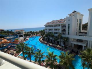 Die Türkische Riviera bei Side empfängt ihre Reisegäste im Sommer mit Temperaturen von deutlich über 30 Grad und das Mittelmeer kommt dicht an die 30-Grad-Marke heran. Beste Voraussetzungen für einen Badeurlaub sind also gegeben. Für alle anderen Aktivitäten eignet sich die Nebensaison besser, Aktiv- und Kultururlauber ziehen beispielsweise die milden Monate Mai, Juni, September und Oktober vor. Im 5-Sterne-Hotel Alba Queen können Türkeireisende das ganze Jahr über eine schöne Zeit verbringen. Die 822 Betten verteilen sich auf 324 Zimmer, sechs verschiedene Zimmertypen gibt es. Außer Standard- und Familienzimmer können u. a Superiorzimmer gebucht werden. Ihnen allen ist eine geschmackvolle Innendekoration mit schön gemusterten Vorhängen und Bettüberwürfen gemein. Während die Klimaanlage für angenehme Temperaturen sorgt, unterhält ein LCD-Fernseher müde Touristen und der Balkon lädt dazu ein, sich draußen aufhalten zu können, ohne vor die Zimmertür gehen zu müssen. Gerade, wenn man seine Ruhe haben möchte, eine feine Sache. Die kostenlose Minibar will durchprobiert werden. Neben dem Hauptrestaurant mit fünf Mal täglich nährreichem und leckerem Buffet gibt es noch das „Queen´s Asia“ und das „Queen´s Fish“, in denen abends nach Voranmeldung geschmaust werden kann. An fünf Bars werden den Hotelgästen Erfrischungsgetränke und verschiedene Alkoholika angeboten.
