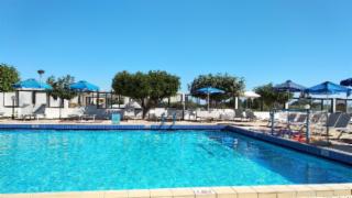 Das Hotel ist etwa 400 m vom Meer entfernt, aber in zentraler Lage in Tigaki.
