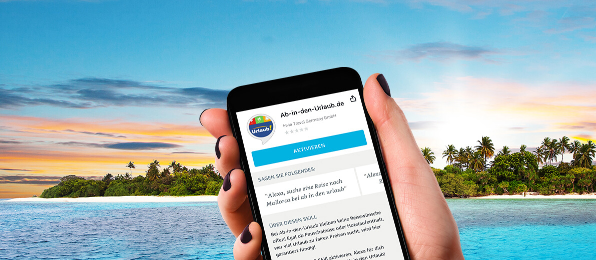 Ab-in-den-urlaub.de-SkillAls erstes großes Online-Reisebüro hat ab-in-den-urlaub.de einen Alexa Skill für die sprachgesteuerte Urlaubssuche entwickelt. Mittels des bereits verfügbaren Skills, der mit der dazugehörigen App von Amazon aktiviert werden kann, haben Kunden sowohl Zugriff auf das veranstalterübergreifende Pauschalreiseangebot als auch auf das Portfolio mit eigener Anreise.