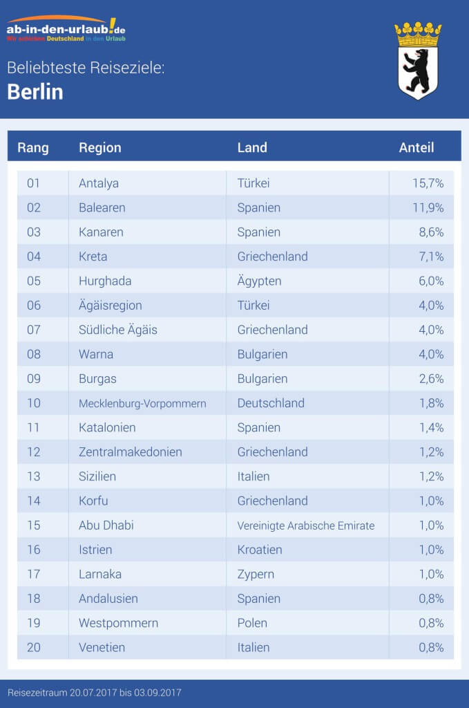 Ab-in-den-urlaub.de_Lieblings-Reiseziele BerlinIn der Hauptstadt sieht die Urlaubswelt schon wieder anders aus. Unter den Top 5 sind Antalya, die Balearen und Kanaren, Kreta sowie Hurghada vertreten. Es folgen die griechische wie auch türkische Ägäis sowie Warna und Burgas. Ebenfalls unter den Top 10: Mecklenburg-Vorpommern mit der von Berlin aus nah gelegenen Ostsee und Mecklenburgischer Seenplatte. Es folgen Sizilien und bemerkenswerter Weise Abu Dhabi. Das Emirat schafft es einzig in Berlin unter die Top-20-Destinationen.