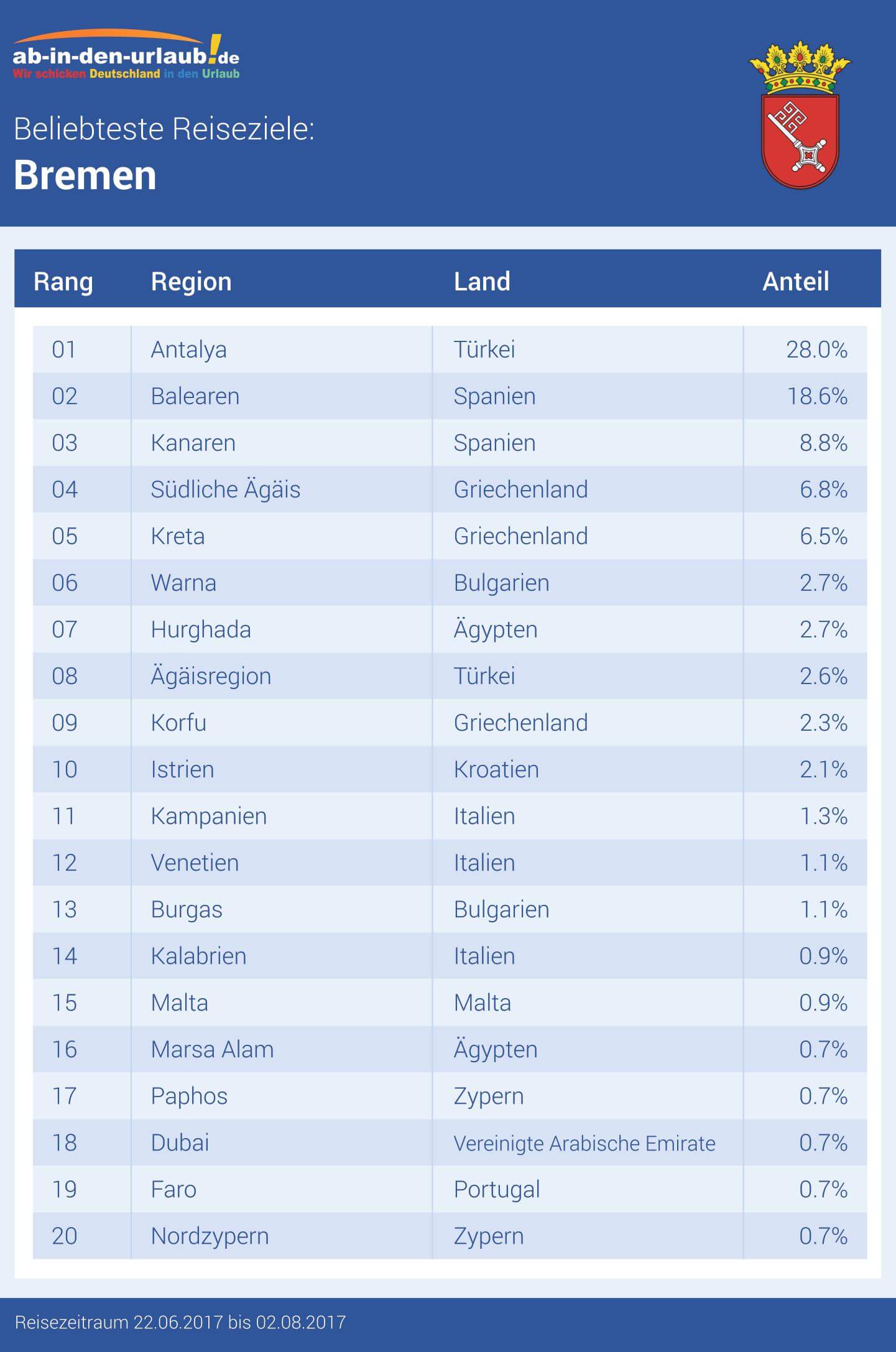 Sind sich Hamburg, Niedersachsen und Bremen bei den Top 3 einig, fallen bei Letzteren besonders Malta und Dubai als beliebte Reisziele auf. In Niedersachsen sind es eher das tunesische Sousse wie auch die Region La Altagracia (Punta Cana) in der Dominikanischen Republik.