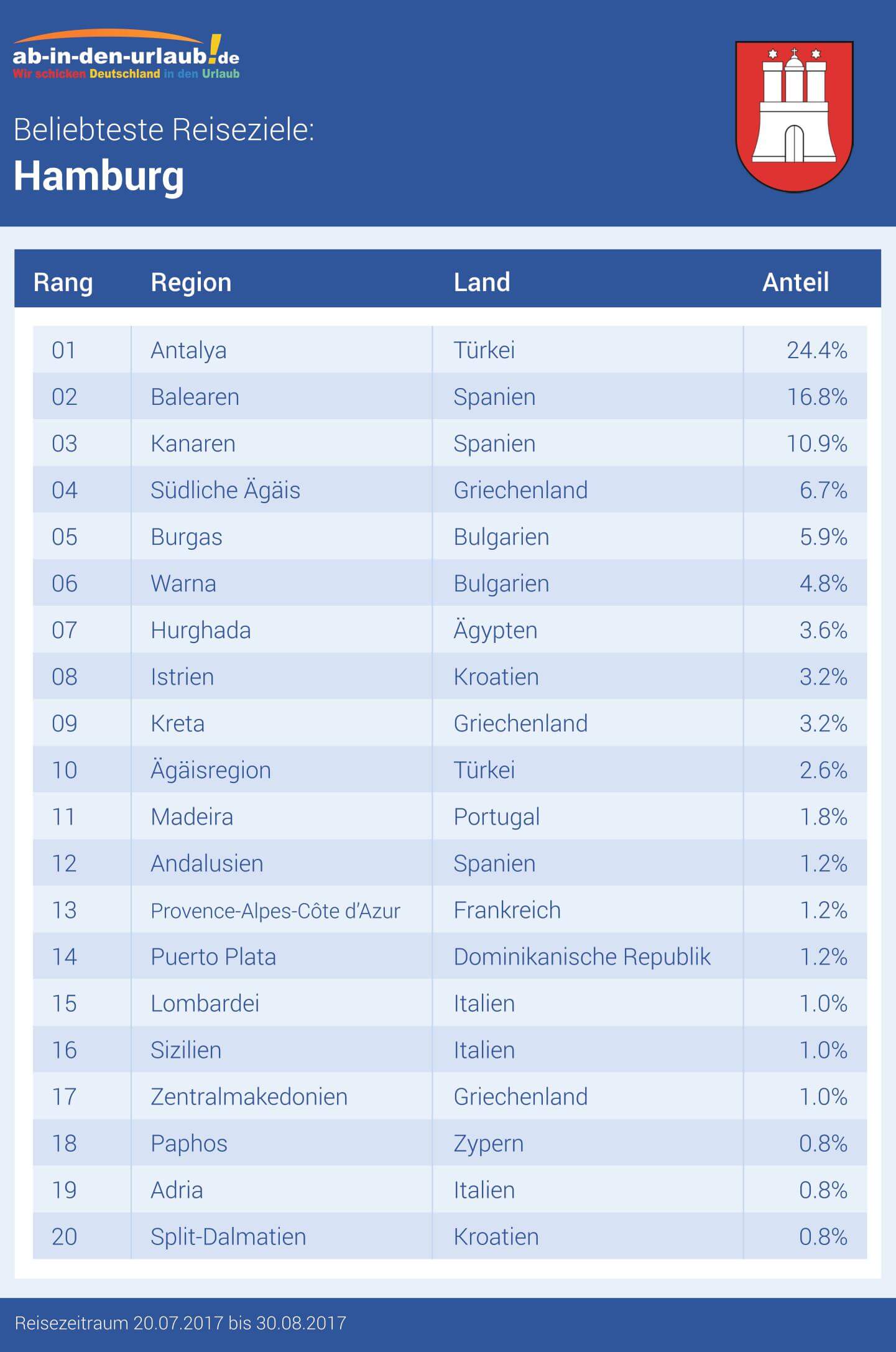 Sizilien dagegen taucht noch ein weiteres Mal auf – auch die Hamburger haben eine Schwäche für die größte Insel im Mittelmeer. Unter den Topplatzierungen geht es dann aber doch eher klassisch zu: Antalya, Balearen & Kanaren und griechische Agäis. „Exotischer“ wird es auf den hinteren Plätzen: So schafft es Frankreich mit Provence und der Côte d’Azur einzig bei den Hamburgern ins Ranking. Außerdem vertreten: Puerto Plata in der Dominikanischen Republik und Paphos auf Zypern.