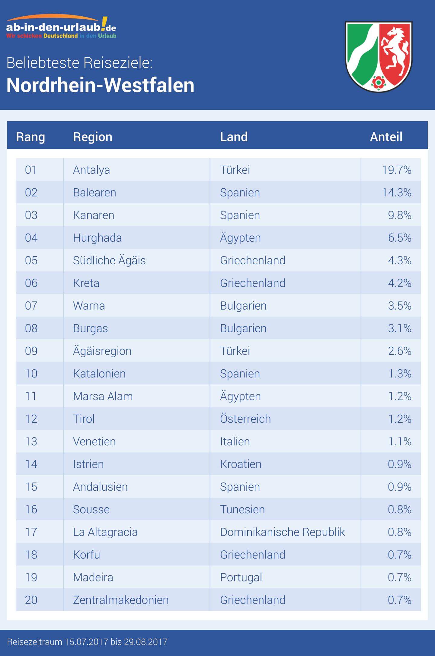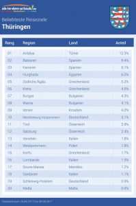 Im bevölkerungsreichen Nordrhein-Westfalen sind Antalya, Balearen und Kanaren die Top-Favoriten. Kann sich Hurghada im Regionen-Ranking noch an den griechischen Zielen vorbeischeiben, haben die Griechen im Ländervergleich die Nase klar vorne. Zudem steht mit Katalonien und Andalusien das spanische Festland hoch im Kurs. Tauscht man Burgas und Warna im Ranking gleicht Platz 1 bis 8 Nordrhein-Westfalens den Zielregionen in Thüringen. Erst danach kommen bei den Thüringern mit Deutschland, Polen, Malta und Marokko andere Reiseländer ins Spiel.