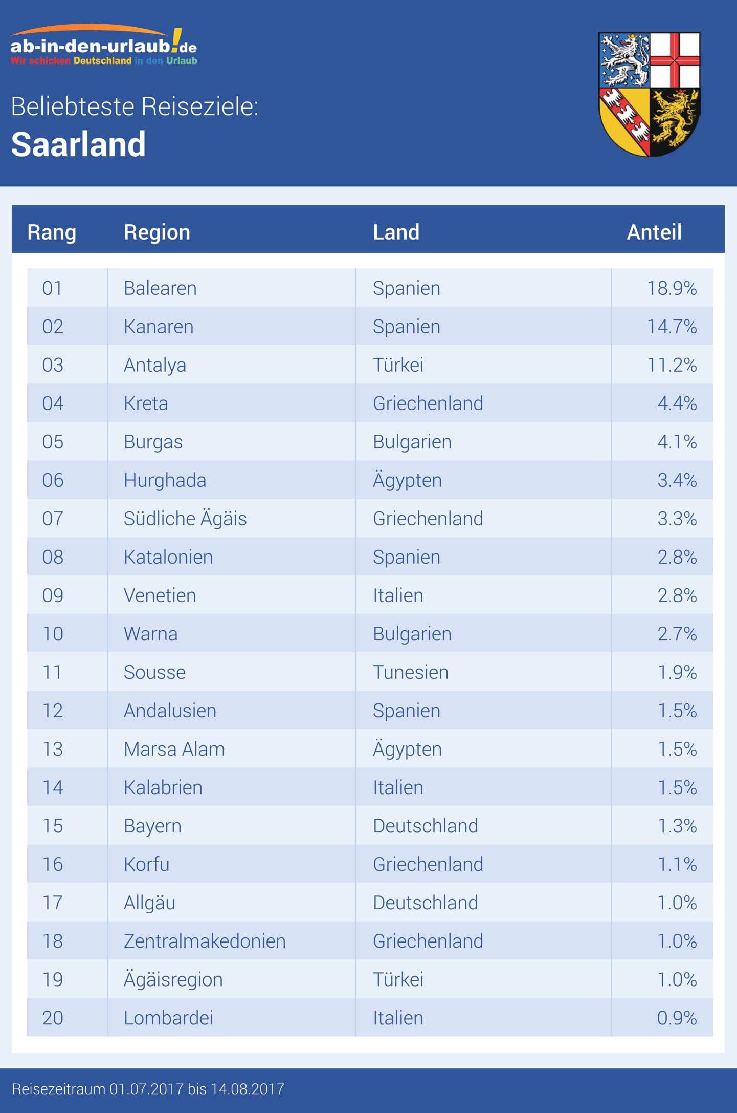 Reduziert man die 20 beliebtesten Urlaubsregionen auf die Reiseländer, ergibt sich daraus für jedes Bundesland eine Anzahl zwischen 9 und 14 Reiseländern. Spitzenreiter ist Schleswig-Holstein, die übersichtlichste Zahl zeigt das Urlaubsverhalten der Saarländer: Hier finden sich unter den Top-20-Regionen viermal Spanien (Balearen, Kanaren, Katalonien, Andalusien) – mit einem Anteil von 37,9 Prozent damit absoluter Hotspot im Sommer, viermal Griechenland (Kreta, Südliche Ägäis, Korfu und Zentralmakedonien), dreimal Italien (Venetien, Kalabrien, Lombardei), jeweils zweimal sind die Türkei (Antalya, Ägäisregion), Bulgarien (Burgas, Warna), Ägypten (Hurghada, Marsa Alam) und Deutschland (Bayern, Allgäu) dabei.