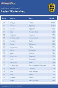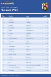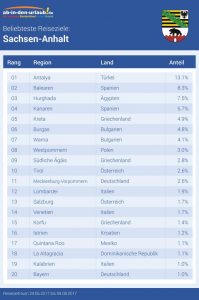 Noch beliebter als in Mecklenburg Vorpommern ist diese Region bei den Sachsen, erreicht immerhin Patz 17 im Ranking. Deutschland ist mit Mecklenburg-Vorpommern und Bayern (Platz 9 und 19) ebenfalls gut vertreten. Auf den Topplatzierungen liegen aber auch hier Antalya, Balearen, Kanaren und Kreta sowie die Südliche Ägäis Griechenland.