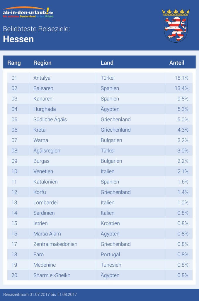 Bei den Plätzen 1 bis 4 sind sich Sachsen und Baden-Württemberg einig. Darüber hinaus steht vor allem das gut zu erreichende Italien hoch im Kurs: Die Regionen Venetien, Lombardei, Adria und Toskana sind hier besonders beliebt. Auch im benachbarten Rheinland-Pfalz fällt die Wahl auf Antalya, Balearen, Kanaren und Hurghada. Ähnlich sieht die Wahl der Reiseregionen in Hessen aus. Auffällig hier: Während sonst die Zielregion in Tunesien immer Sousse ist, verschlägt es die Hessen bevorzugt nach Medenine. Außerdem ist Hessen das einzige Bundesland, bei dem es das italienische Sardinien ins Ranking geschafft hat – auf Platz 14.