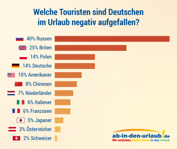 Zum Jahresende lohnt sich ein Rückblick auf die vergangenen Monate. Der Urlaub zählt für viele sicher zu den bleibenden Erinnerungen. Dabei kommt einem aber auch der eine oder andere Miturlauber in den Sinn. Die Travel-Plattform ab-in-den-urlaub.de wollte es genauer wissen und hat in Zusammenarbeit mit der Keyfacts Onlineforschung GmbH bei den Deutschen nachgefragt: Touristen aus welchen Ländern sind ihnen im Urlaub positiv oder negativ aufgefallen und warum? Zur Wahl standen zwölf Nationalitäten: Russen, Briten, Polen, Niederländer, US-Amerikaner, Chinesen, Franzosen, Italiener, Japaner, Österreicher, Schweizer und natürlich die Deutschen selbst.*