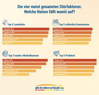 Die meisten Nationen bleiben den deutschen Urlaubern aufgrund ihrer Lautstärke in Erinnerung. Da sind vor allem die Russen (60%), Italiener (59%) und Amerikaner (52%) kaum zu überhören. Die russischen und polnischen Urlauber fallen außerdem durch ihren Alkoholkonsum (56/50%) und ihre schlechten Essmanieren (50/45%) auf. Die Befragten sind sich einig, dass Amerikaner und Italiener – neben ihrer Lautstärke (52/59%) – mit schlechten Essmanieren (beide 49%) und als unsympathisch (35/34%) in Erinnerung bleiben.
