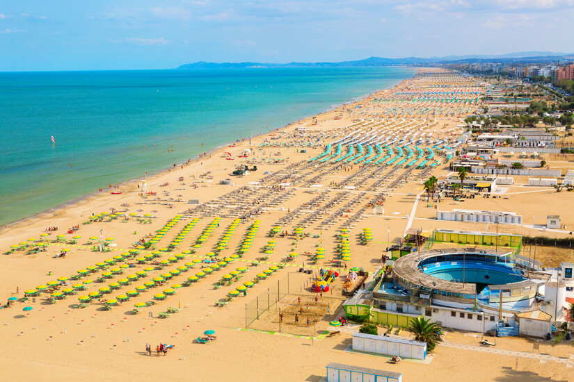 Riccione grenzt südlich an Rimini und ist ihm ähnlich, zumindest was den Strand angeht. Die beiden gehen nahtlos ineinander über und so ist auch Ricciones Strand gut ausgestattet mit Liegen, Sonnenschirmen und Gastronomie. Das Wassersportangebot in Form von tauchen, schnorcheln oder Wasserski fahren kann sich ebenso sehen lassen. Besteht einmal keine Lust auf Baden in der salzhaltigen Adria, lockt der Wasserpark Aquafan mit seinen Attraktionen. Für Spaß sorgt außerdem der Hochseilgarten Riccione Avventura, sofern ihr schwindelfrei seid.
