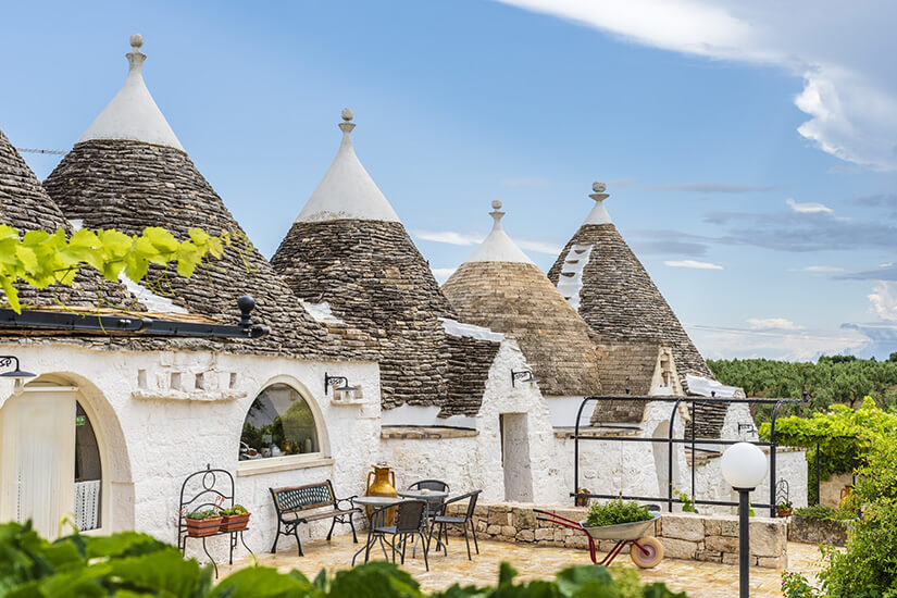 Ein Trullo – so die Einzahl von Trulli – ist ein meist weißes Rundhaus mit einem kegelförmigen Steindach. Gefertigt wird es aus geschichteten Kalkfelsen, die in der Gegend gewonnen werden können. Die Bauweise orientiert sich an Hirtenhütten, aber auch an griechischen Kuppelbauten. Die Dächer aus Stein werden durch einen Schlussstein oder eine Kugel sowie das eine oder andere christliche Symbol ansprechend verziert.