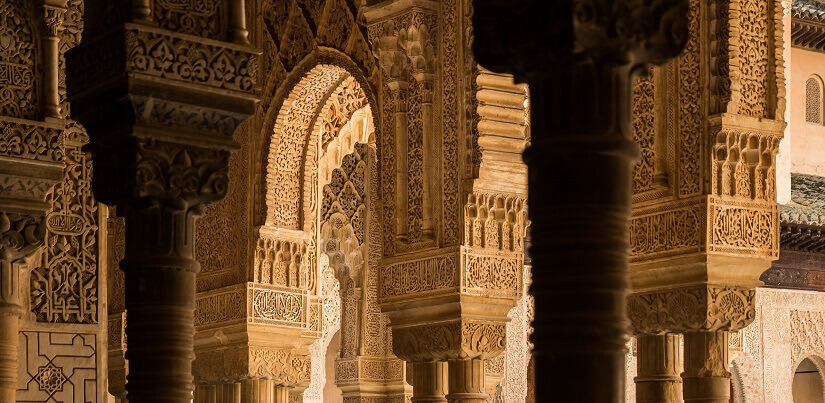Die Nasridenpaläste stellen die Hauptattraktion der Alhambra dar. Sie waren unter anderem der Sitz der Verwaltung. Zu ihnen gehören neben hübschen Gebäuden noch Höfe und Gärten. Im Mexuar (arabisch “Verwaltungsbereich”) stehen vier schmale Säulen, an die zur Decke hin schöne Verzierungen anschließen. Der untere Bereich der Wände ist mit glänzenden Fliesen dekoriert, während die Decke aus Holz ebenfalls kunstvoll gestaltet ist.
