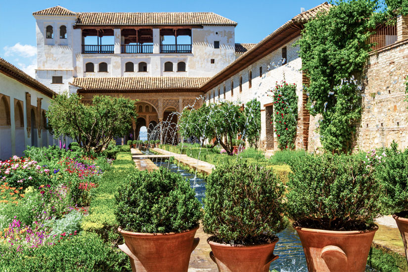 Innerhalb des Sommerpalasts liegt der Patio de da Acequia (Hof des Bewässerungskanals), der seinem Namen alle Ehre macht. Dank ihm könnt ihr mehrere Brunnen in Aktion sehen. Bepflanzt wurde dieser Bereich außer mit Myrte und Zypressen noch mit Orangenbäumen sowie Rosen. Ein weiterer Hof ist der Patio de la Sultana (Sultaninhof), welcher durch ein U-förmiges Wasserbecken gekennzeichnet ist, an dessen Rändern einzelne Wasserfontänen stehen. Im Inneren des “U” befindet sich ein Brunnen, der von zwei bepflanzten Flächen umgeben ist. Im Garten rund um den Palast wuchsen früher nicht nur Büsche und Bäume, es wurde auch Obst und Gemüse angebaut.