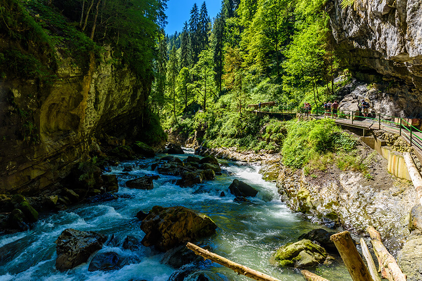 Spektakuläre Schluchten, plätschernde Wasserfälle und glasklare Seen – das Allgäu ist ein Paradies für Naturliebhaber. So lockt die Breitachklamm bei Oberstdorf mit einer 150 Meter tiefen Felsschlucht – der tiefsten in ganz Mitteleuropa. Zwischen den rauen mächtigen Felswänden führt ein begehbarer Weg hindurch, der euch einen atemberaubenden Blick auf die umliegenden Felsen sowie den rauschenden Gebirgsbach bietet. Am Ende der Klamm findet ihr die Kesselbachfälle sowie die Judenkirche, ein sechs Meter hohes Felsentor.