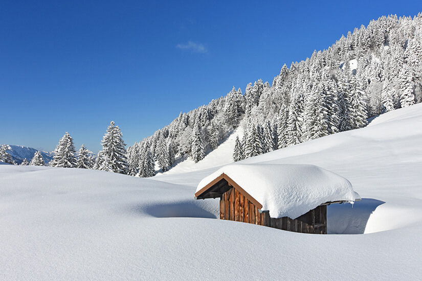 Verschneite Landschaft, weiße Berge und urige Hütten – im Winter verwandelt sich das Allgäu zu einem märchenhaften Winterwunderland mit einer gigantischen Kulisse der Berglandschaft.