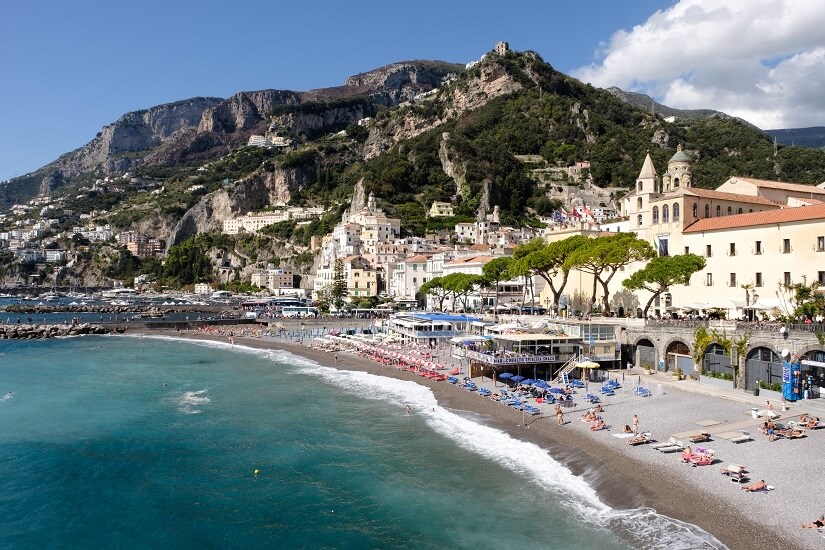 Die Stadt Amalfi hat dem Küstenzug seinen Namen gegeben und zählt mit rund 5.200 Einwohnern zu den kleineren Orten auf der Bergkette. Die einstige Hafenstadt gehörte im Mittelalter den vier großen Seerepubliken an und kontrollierte somit die Handelsflotten nach Vorderasien. Die römische Vergangenheit ist der Kleinstadt bis heute anzusehen – mit Sehenswürdigkeiten wie dem Dom Sant’Andrea, ihrem Kreuzgang „Chiostro del Paradiso“, dem „Arsenale“ als mittelalterliche Werft am Hafen sowie den alten Maultierpfaden und Treppenwegen. Diese laden zu unvergleichlichen Wanderungen im nahegelegenen Tal „Valle delle Ferriere“ mit beeindruckenden Wasserfällen und wilden Flüssen ein. Als früheres Zentrum der Papierherstellung befindet sich hier das Papiermuseum „Museo della carta“.