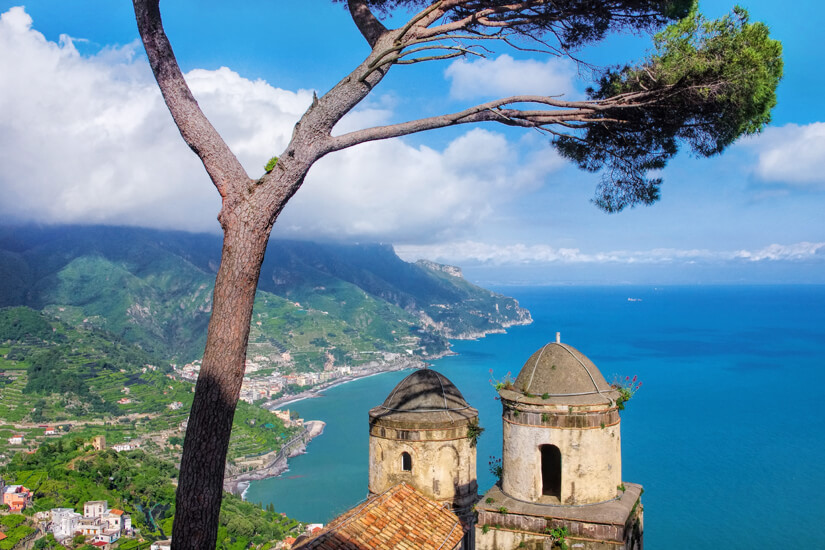 Der Ort Ravello liegt etwa fünf Kilometer von der Küste entfernt und ist weltberühmt für sein „Ravello Festival“, welches bereits im Jahr 1953 zu Ehren von Richard Wagner ins Leben gerufen wurde. Weiterhin besticht Ravello durch seine faszinierenden Ausblicke sowie die farbenfrohen Keramikfliesen zwischen Villen und großzügigen Gärten. Hier findet sich nicht nur einer, sondern gleich eine Vielzahl an historischen Palästen sowie imposanten Nobelvillen. Dazu gehören beispielsweise die „Villa Rufolo“ mit einer Parkanlage aus dem 12. Jahrhundert oder die „Villa Cimbrone“ als angeblich schönster Aussichtspunkt von ganz Italien.