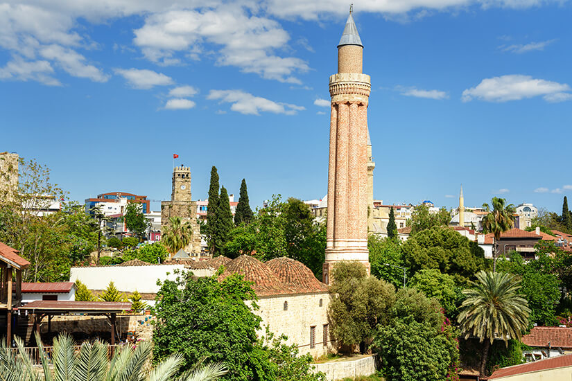 Die Yivli Minare Moschee wurde teilweise im 13. Jahrhundert erbaut. Sechs Kuppeln und das rund 40 Meter hohe Minarett in Backsteinfarben sind die unverkennbaren Hingucker des Gotteshauses, das erstmals vermutlich unter Sultan Kai Kobads I. Herrschaft errichtet wurde. Zwischenzeitliche Zerstörungen konnten die imposante Erscheinung der Moschee, die als heimliches Wahrzeichen Antalyas gilt, nicht verringern.