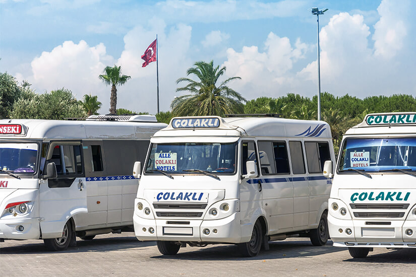 Innerorts könnt ihr prima mit dem Dolmuş fahren. Dabei handelt es sich um eine Art Sammeltaxi in Form eines Kleinbusses. Wenn ihr mitfahren möchtet, müsst ihr ein Handzeichen geben, sobald sich ein Bus nähert. Dasselbe gilt beim Wunsch wieder auszusteigen. Normalerweise kostet die Mitfahrt pro Person einen Euro und ist damit sehr günstig.