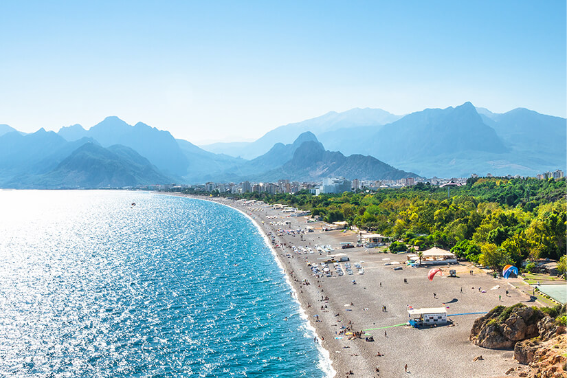 Auch der rund 13 Kilometer lange Konyaalti Beach ist von Antalya nicht weit entfernt. Er teilt sich in einen Kiesel- und einen Sandbereich auf. Nahe des Strandes könnt ihr in Wasser- oder Freizeitparks einen besonderen Adrenalinkick erleben. Der rund 15 Kilometer nördlich von Antalya gelegene Strand von Olympus ist in eine idyllische Landschaft eingebettet. Der teilweise unter Naturschutz stehende Strand bildet zum Beispiel eine hervorragende Kulisse, um Meeresschildkröten bei der Eiablage zu beobachten.