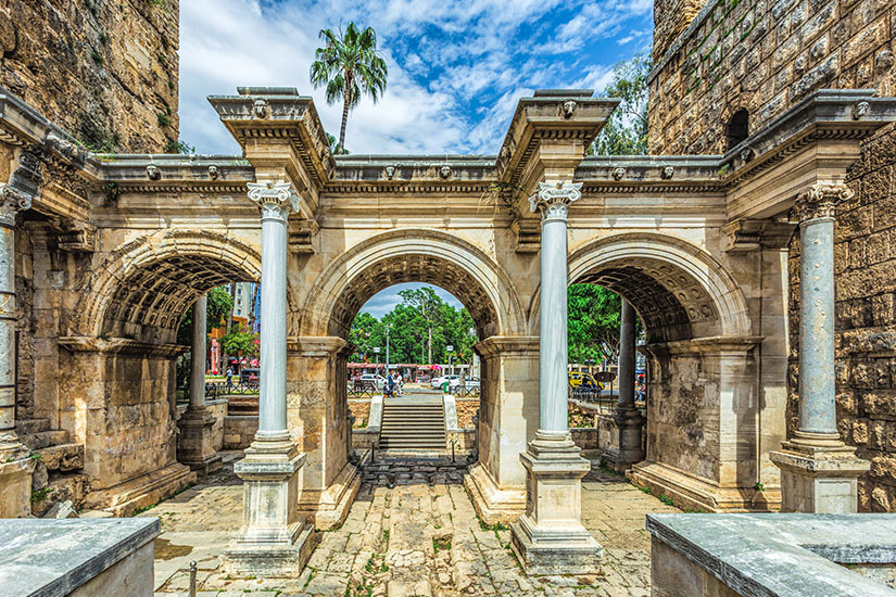 Die Altstadt Antalyas heißt Kaleici. Hier findet ihr klassische Sehenswürdigkeiten wie die alte Stadtmauer und das über 1.800 Jahre alte Hadrianstor. Das Tor stammt aus der Römerzeit und gilt somit als eines der ältesten Bauwerke Antalyas. Es wurde vermutlich im zweiten Jahrhundert nach Christus errichtet. Freistehende Ehrenbögen und zwei Wachtürme prägen das Erscheinungsbild des Tores.