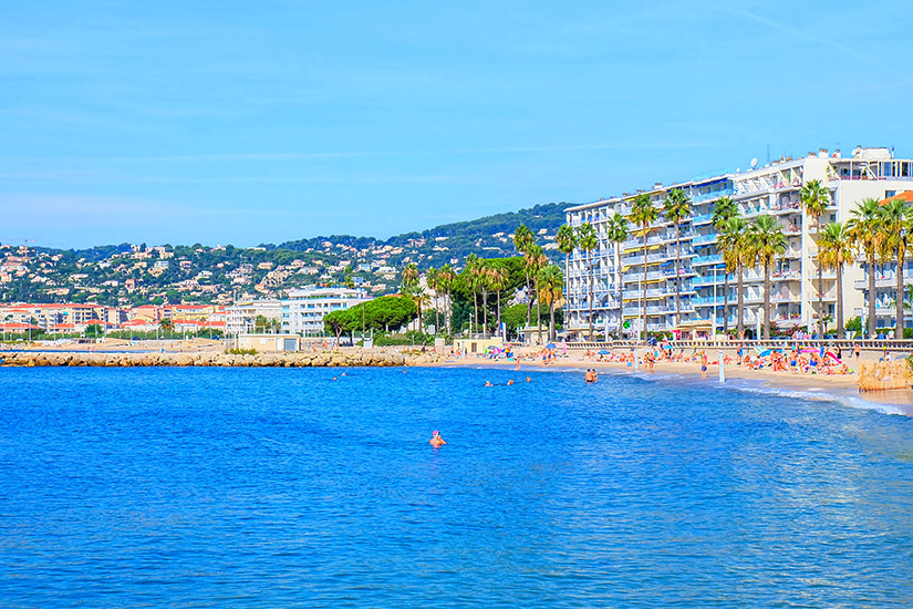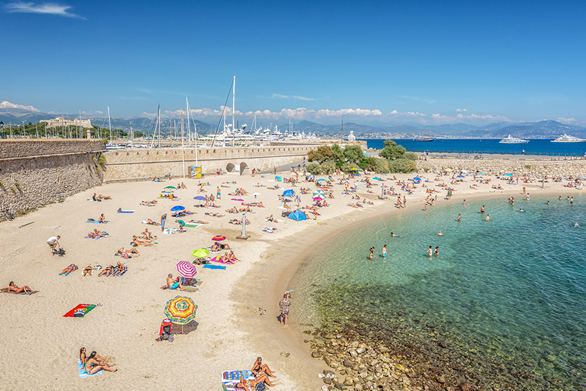 In Juan-les-Pins wird der Strandurlaub auf die höchste Stufe gehoben: Es gibt feinen Sand, eine von Palmen gesäumte Promenade und schattenspendende Pinien im Hintergrund. Dazu kommen der ruhige Wellengang und der flache Verlauf, der ein sicheres Baden ermöglicht. Logisch, dass es hier zur Hochsaison etwas voller werden kann. Wer mag, kann vor Ort einen Liegestuhl mieten oder eines der Cafés besuchen.