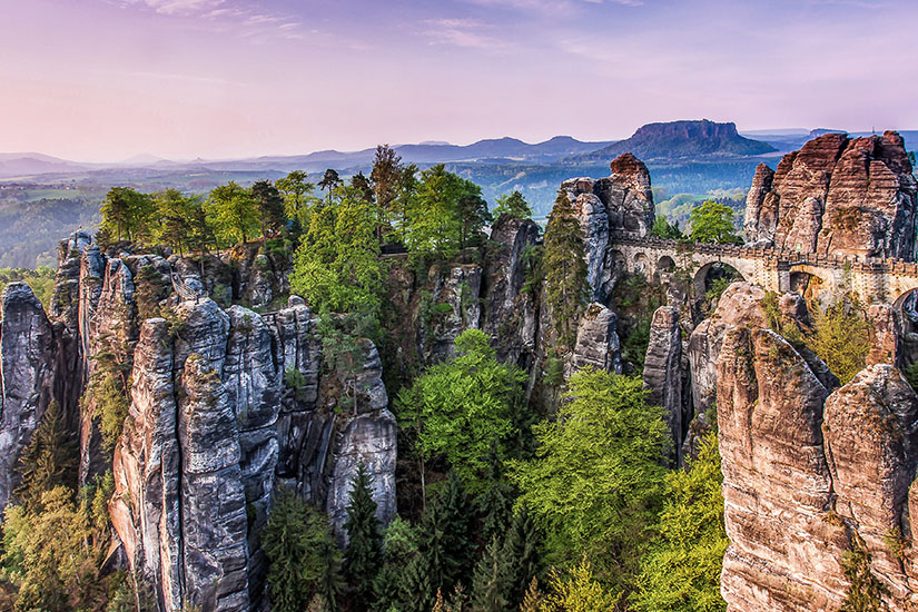 Die imposante Felsformation ist die wohl berühmteste Touristenattraktion der Sächsischen Schweiz. Besuchern bietet sich auf dem 194 Meter über dem Elbspiegel gelegenen Sandsteinplateau ein unvergesslicher Blick über die Tafelberge auf das Elbtal und bei klarem Wetter auch das benachbarte Lausitzer Bergland. 1826 gab es bereits eine Basteibrücke, diese bestand jedoch aus Holz und wurde 1851 durch die bis heute bestehende Sandsteinbrücke ersetzt. Das beliebte Fotomotiv hat eine Länge von 76,5 Metern und seine sieben Bögen überspannen eine 40 Meter tiefe Schlucht, die Mardertelle.