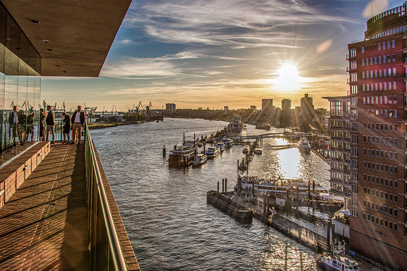Das im November 2016 fertiggestellte Konzerthaus im Hamburger Stadtteil HafenCity trägt den liebevollen Beinamen „Elphi“. Ein gigantischer Publikumsmagnet ist die öffentliche Aussichtsplattform (Plaza) zwischen dem Backsteinsockel des alten Speichers und dem gläsernen Neubau der Elbphilharmonie. Hier strömen täglich bis zu 17.000 Gäste hin, um in 37 Metern Höhe den Ausblick auf Stadt und Hafen zu genießen. Auf der Plaza können Besucher perfekt den Sonnenuntergang über den Dächern Hamburgs auf sich wirken lassen. Ein herrlicher Ausklang nach einem City-Trip.
