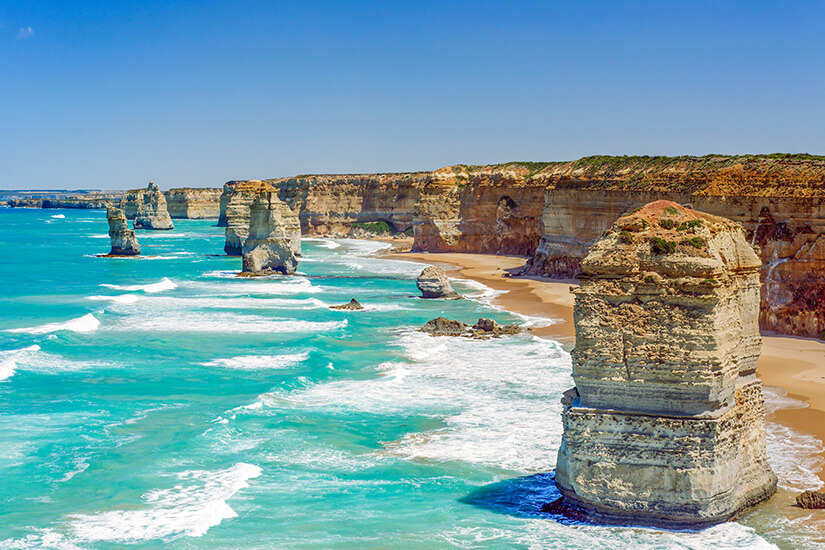 Der Höhepunkt der Great Ocean Road in Victoria ist der Nationalpark Port Campbell als Teil der Kulturlandschaft der Aborigines. Eine Besonderheit sind die Zwölf Apostel. Dabei handelt es sich um freistehende Felsen, die vor bis zu 20 Millionen Jahren entstanden sind. Sie erheben sich ungefähr 45 Meter aus dem Meer und werden von der Abendsonne in ein orangerotes Licht getaucht. In der Dämmerung kehren Pinguine zurück an den Strand. Tagsüber lassen sich Pelikane und Enten blicken.