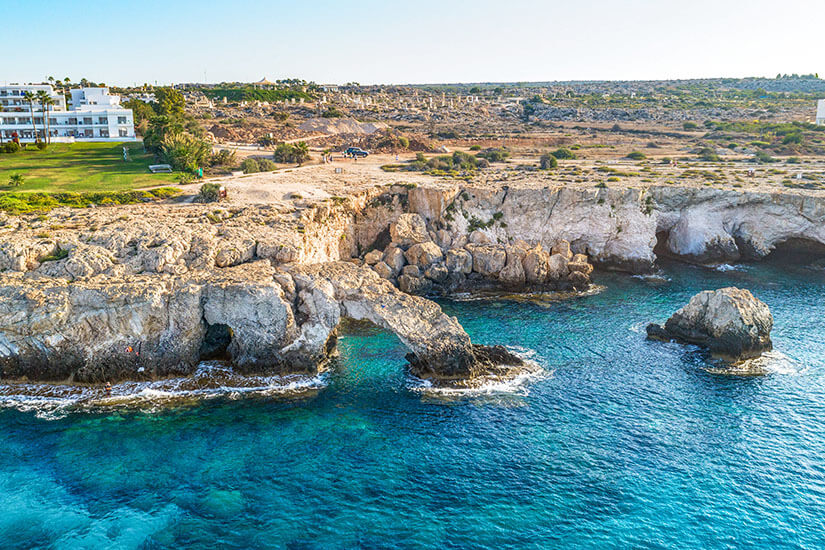 Nahe dem Kap Grecos schließt sich ein romantischer Ort an: Die im Volksmund als „Liebesbrücke“ bezeichnete Felsenbrücke von Ayia Napa. Hier finden regelmäßig Heiratsanträge in traumhafter Kulisse statt. Der Ort zieht Besucher von nah und fern in ihren Bann. Bringt genug Zeit mit, denn wahrscheinlich müsst ihr ein wenig warten, um die Liebesbrücke für euch zu haben und einen großartigen Schnappschuss zu ergattern.