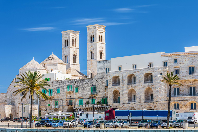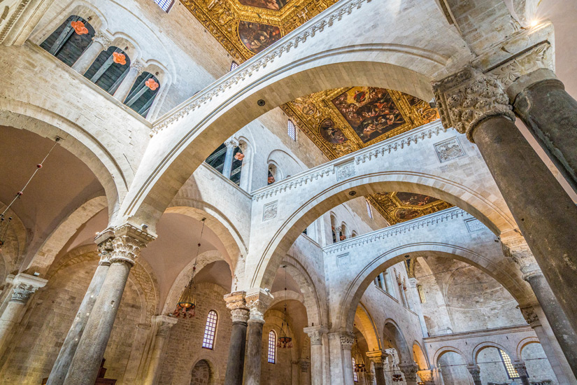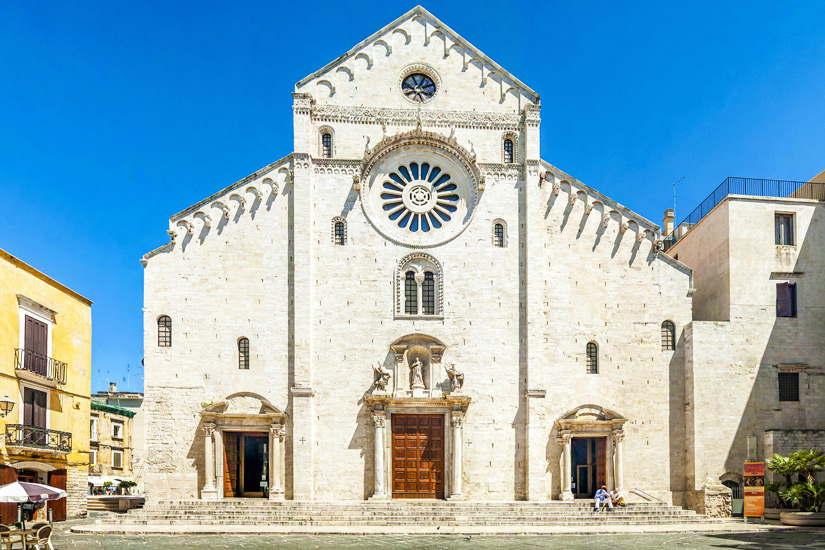 Aus dem 12. Jahrhundert stammt die weiße Kathedrale von Bari, die auch San Sabino heißt. Auf den Ruinen einer einst byzantinisch geprägten Kirche erbaut, zeigt sich der Sakralbau mit drei Holzportalen als eindrucksvoller Repräsentant der romanischen Architektur. Die Krypta beherbergt zahlreiche Reliquien des Heiligen Sabinus, dem die Kathedrale auch gewidmet wurde.