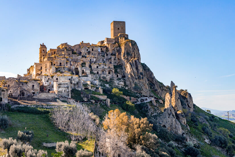 Craco nimmt eine Sonderstellung unter den Ortschaften in der Basilikata ein, denn es handelt sich um eine mittlerweile leider nicht mehr öffentlich zugängliche Geisterstadt. Nach einem Erdrutsch in den 1960er-Jahren verließen die ehemaligen Bewohner den Ort. Seither steht das Dorf leer, thront hingegen noch immer majestätisch auf einem Felsgipfel. Aus sicherer Entfernung könnt ihr wunderbare Fotos von Craco machen und die einstige James-Bond-Filmkulisse bestaunen.