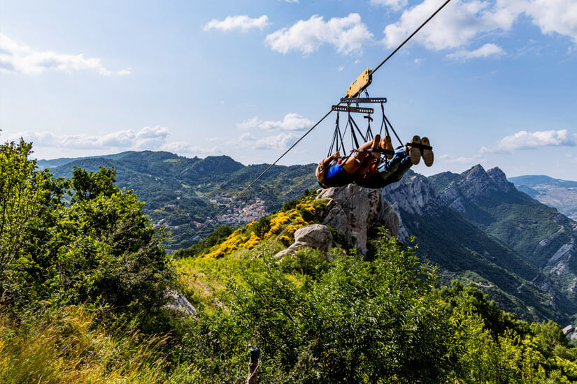 Liegt das Interesse woanders, solltet ihr euch einmal die Abenteuersportarten in der Region ansehen. Sie beginnen mit Rafting auf den Flüssen im Pollino Nationalpark, führen über Canyoning und Klettertouren in den Bergen und enden beim sogenannten „Flug des Engels“ in Castelmezzano, der die Landschaft aus der Vogelperspektive offenbart. Es ist eine knapp anderthalb Kilometer lange Strecke, die ihr mithilfe einer Seilrutsche bewältigt. Geschwindigkeiten von bis zu 120 Kilometern pro Stunde dürfte auch mutige Reisende, in einer Höhe von 130 Metern, kurz sprachlos machen.