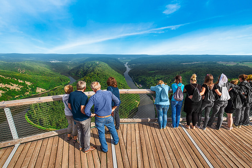 Hoch oben über der Saarschleife, in 23 Metern Höhe, schlängelt sich der Baumwipfelpfad entlang. Der Holzpfad führt zwischen Eichen, Buchen und Douglasien entlang. Unterwegs begegnen euch zahlreiche Lernstationen, bei denen ihr mehr über den Wald sowie seine pflanzlichen und tierischen Bewohner erfahren werdet. Die Kinder können hier auf spielerische Art einem Eichhörnchen auf einer Rallye durch den Wald folgen. Für eine erlebnisreiche Abwechslung sorgen wackelige Hängebrücken und spaßige Rutschen, die nicht nur den Kids Freude bereiten. Hier findet ihr die perfekte Mischung aus Spaß und Action.