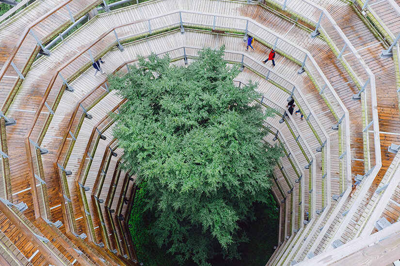 Der Baumkronenpfad in brandenburgischen Beelitz-Heilstätten, 50 Kilometer südlich von Berlin, steht ganz unter dem Motto „Baum und Zeit“. Auf rund 320 Metern Länge erkundet ihr die Baumwipfel, entdeckt deren Bewohner und erlebt die Weltkriegsruinen der ehemaligen Beelitzer Heilstätten von oben. Die Backsteinmauern voller Efeuranken sowie die zerbombten und von Blättern bewachsenen Dächer bietet einen ungewöhnlichen, bizarren Anblick. Von der circa 40 Meter hohen Aussichtsplattform könnt ihr bis nach Berlin schauen, wenn die Sicht klar ist. Das Highlight: Den Baumkronenpfad könnt ihr an ausgewählten Tagen sogar nachts besuchen und unterschiedliche Performances gespannt bestaunen.