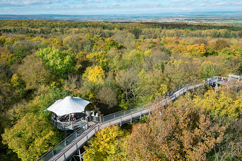Der Baumwipfelpfad im oberfränkischen Steigerwald ist einer der ältesten in Deutschland. Das Besondere an diesem Pfad: Er steigt so langsam an, dass er sich durch alle Etagen des Waldes schlängelt und euch eine Rundum-Perspektive auf die Baumkronen bietet und entsprechend bestens für Kinderwagen, Rollstuhlfahrer und ältere Menschen geeignet ist.