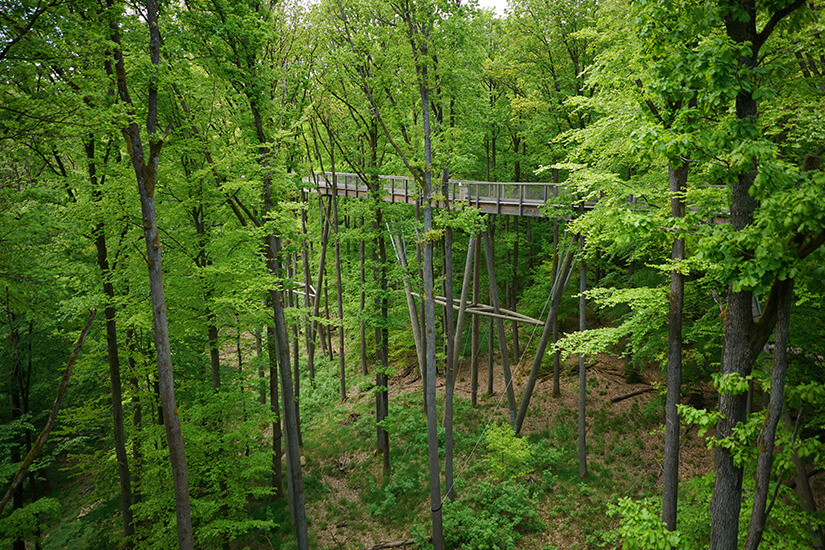 Mitten im Herzen des Nationalpark Hainich, der zum UNESCO-Weltnaturerbe gehört, führt euch ein Baumwipfelpfad durch insgesamt vier Themenbereichen über die Baumkronen der hohen Laubbäume hinweg. In diesem Teil des Waldes leben zahlreiche Bewohner, wie 500 verschiedene Käfer- und über 550 Schmetterlingsarten, Fledermäuse, Wildkatzen und Spechte, über die ihr bei eurer Reise viel Wissenswertes lernen werdet. Hier erfahrt ihr jedoch nicht nur eine Menge über die Tier- und Pflanzenwelt des Naturschutzgebietes, auch Adrenalinjunkies können sich hier oben an zwei Seilkletterstationen so richtig austoben.