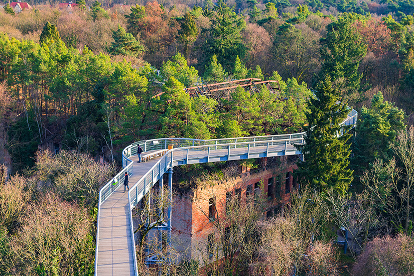 Wenn ihr die Baumwipfelpfade ausreichend erkundet habt, geht eure Tour am Fuße noch weiter. Dort könnt ihr die Ruinen der Heilstätten aus nächster Nähe betrachten und deren historische Eindrücke einfangen. Auf diesem rund sieben Hektar großen Gelände haben sich früher Tuberkulosepatienten von ihrer Lungenkrankheit kuriert.