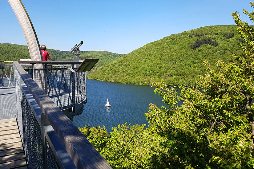 Wenn ihr diesen 1250 Meter langen Baumwipfelpfad bis zum Ende geht, werdet ihr an der letzten Station mit einem phänomenalen Ausblick belohnt. Der 42 Meter hohe Aussichtsturm des Naturparks Saar-Hunsrück wurde in Form eines Halbkreises konstruiert und ist damit ein Spiegelbild der Saarschleife – nur eben in luftiger Höhe. Von hier aus könnt ihr bei guter Sicht sogar bis raus auf die Vogesen blicken.