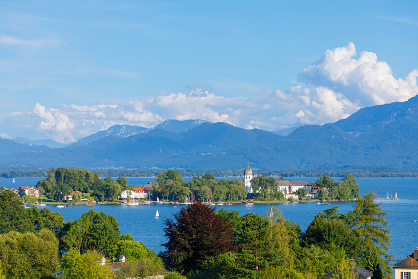 Rund um den 80 km² großen Chiemsee gibt es eine Vielzahl an Bademöglichkeiten, so zum Beispiel das Strandbad Breitbrunn im Westen, das Strandbad Chieming im Osten, das Strandbad Seebrück im Norden oder das Strandbad Übersee im Südosten. Einige Bäder sind kostenlos, für andere muss ein geringer Eintritt gezahlt werden. Mit dem Tretboot oder Ruderboot könnt ihr auf den See hinausfahren. Der Chiemsee ist aber noch aus anderen Gründen reizvoll: Zum Großteil befinden sich Wiesen und Moore an seinem Ufer. Die Fraueninsel mit dem Benediktinerinnenkloster Frauenwörth und die Herreninsel mit dem Schloss Herrenchiemsee stellen Ausflugsziele im See dar. Fahrt ihr den Chiemsee Radweg entlang, legt ihr eine Strecke von 59 km zurück.