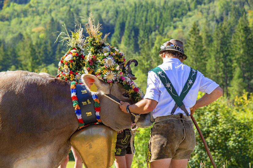 Zum kulturellen Erbe Bayerns zählt der Almabtrieb beziehungsweise die Viehscheid im Spätsommer, genauer gesagt im September. Wenn die Bauern ihre Rinder von den Almen zurück ins Tal führen, wird dies gebührend gefeiert. Das Glocken- und Schellengeläut der festlich geschmückten Tiere kündigt ihr Kommen an. Blasmusik wird gespielt und mit jeder Maß steigt die Stimmung im Bierzelt.
