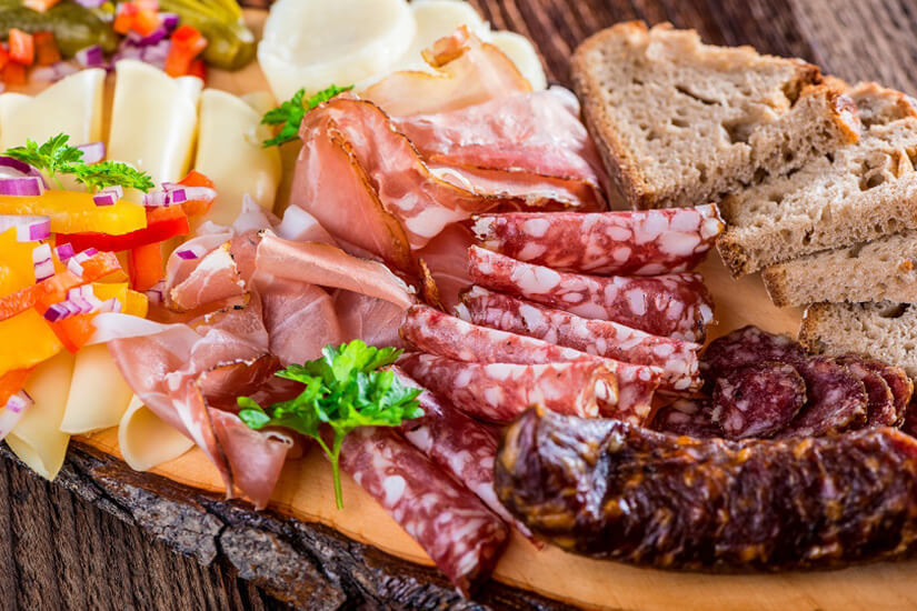 Eine herzhafte Brotzeit, eingenommen auf einer Almhütte oder im Hotel in den Bayerischen Alpen, gehört im Urlaub einfach dazu. Brot, unterschiedliche Käse- und Wurstsorten, Schinken, Gewürzgurken schmecken nicht nur gut, sondern machen auch satt. Was in anderen Regionen Bayerns gegessen wird, schmeckt auch in den Alpen und so dürft ihr euch über Brezeln und Weißwürste freuen.