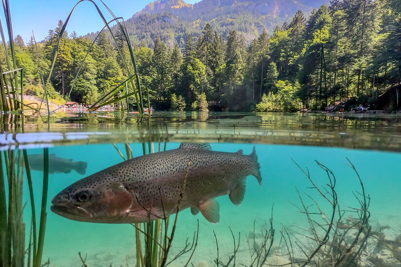 Die Besonderheit des Blausees ist sein kristallklares und tiefblaues Wasser, welches euch bis auf den zwölf Meter tiefen Grund schauen lässt. Diese klare Sicht verdankt der See den unterirdischen Quellen, aus denen er gespeist wird. Durch eine Absorption des roten, langwelligen Lichts, bleibt nur noch die beeindruckend tiefblaue Farbe des Sees übrig. Am Grund seht ihr Fische, die sich um knorrige Baumstämme und schroffe Felsen tummeln, als wären sie greifbar nah. Das saubere und mineralhaltige Bergquellwasser verspricht höchste Wasserqualität sowie eine immer gleichbleibende Temperatur von eisigen acht Grad Celsius. Dies ist natürlich auch ein Paradies für Fische. So befindet sich direkt am See eine Bio-Forellenzucht, in der Regebogen- und Lachsforellen prächtig gedeihen können und euch kulinarische Genüsse ermöglichen. Das Schwimmen im See bleibt daher nur den Forellen vorbehalten. Die grüne bergige Landschaft um den Blausee entstand durch einen Felssturz vor rund 15.000 Jahren, welcher auch den See hervorbrachte, der 887 Meter über dem Meeresspiegel liegt.