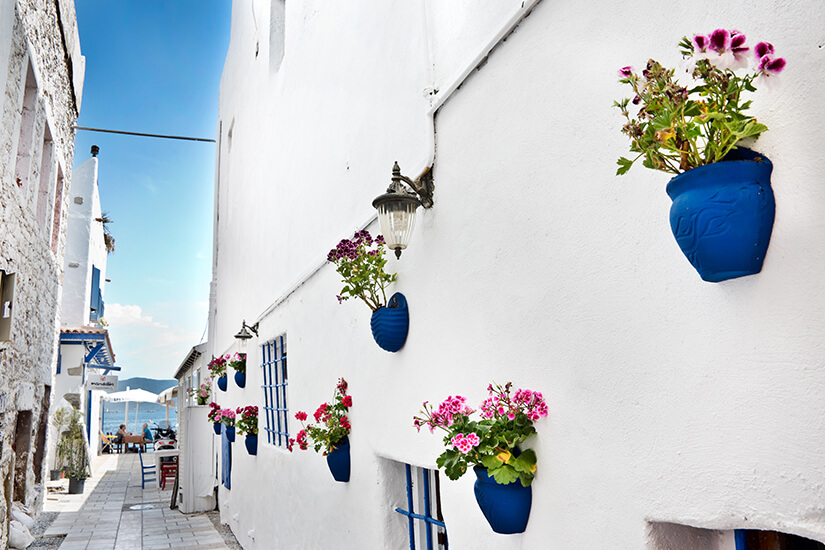 Bodrum wird auch „die weiße Stadt“ genannt, denn nahezu alle Häuser sind aus weißem Kalkstein und strahlen mediterranes Flair aus. An den glänzenden Fassaden erblühen lilafarbene Drillingsblumen in blauen Blumenkästen und machen einen Stadtbummel durch die engen kopfsteingepflasterten Gassen zu einem wahren Augenschmaus. Neben dem Duft der Blumen werdet ihr hier auch Aromen von Gewürzen, Kaffee und dem Meer wahrnehmen und mediterranes Feeling mit allen Sinnen spüren. So lohnt sich ein Spaziergang durch die Altstadt, bei dem ihr euch entweder einen türkischen Tee in einem Café gönnen oder euch auf die Suche nach Souvenirs begeben könnt. Habt ihr kein passendes Mitbringsel für eure Liebsten entdeckt, locken zahlreiche Wochenmärkte und Basare, auf denen ihr garantiert ein Andenken an euren Urlaub findet.