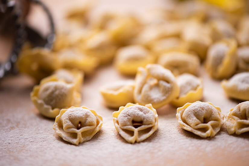Bologna ist die Heimat der Pasta-Kreation Tortellini und diese werden hier noch auf traditionelle Weise serviert, nämlich mit Fleischbrühe. Der Legende nach sind die ringförmigen Teigwaren ein Symbol des Bauchnabels von Aphrodite, der Göttin der Liebe. Gefüllt sind die köstlichen Nudeln meist mit Mortadella oder Schinken und nach dem Garen in Hühnerbrühe, werden sie in Butter und Salbei geschwenkt. Eine vegetarisch Variante bietet eine Füllung aus Spinat und Ricotta.
