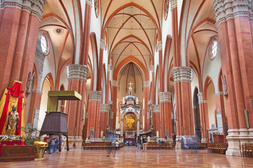 Mitten auf der Piazza Maggiore könnt ihr eine der größten Backsteinkirchen der Welt bestaunen: die Basilica di San Petronio. Sie misst unglaubliche 130 Meter Länge und 60 Meter Breite. Falls ihr euch wundert, warum das Äußere des Gotteshauses nur zur Hälfte mit Marmor verziert wurde, ist die Erklärung recht simpel. Während der Bauarbeiten im 17. Jahrhundert hatte Bologna mit Geldsorgen zu kämpfen und so solltet ihr euch lieber das prunkvolle Innere der Basilika ansehen, welches mit detailreichen Fresken, riesigen Säulen, bunten Fenstern und imposanten Gemälden beeindruckt.