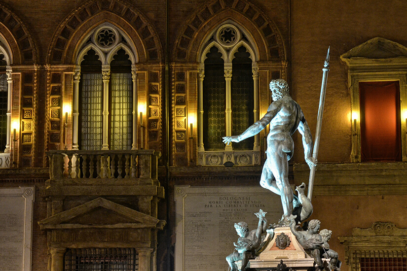 Auf der Piazza Nettunno, einem Platz mitten im Zentrum von Bologna, könnt ihr den legendären Neptunbrunnen bestaunen. Umgeben von Sirenen, Nymphen und Delfinen, präsentiert sich der Meeresgott Neptun hier in Bronze und einer Größe von über drei Metern. Aufgrund seiner Größe wird er von den Lokalen daher liebevoll „Il Gigante“ (der Riese) genannt.