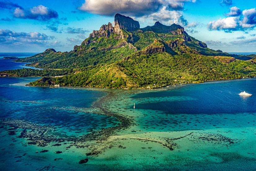 Das gerade einmal 38 Quadratkilometer große ringförmige Riff von Bora Bora ist ein ausgeloschener Vulkan, der mittlerweile unter der Meeresoberfläche versunken ist. Über dem Meer erheben sich nur noch Reste des Kraterrandes. Zu diesen gehört die Hauptinsel Bora Bora. Sie ist neun Kilometer lang und beherbergt den Mont Otemanu mit 727 Metern Höhe den höchsten Punkt der Insel. Rund um die Hauptinsel gibt es noch zahlreiche andere vorgelagerte Inseln, die sich prima im Rahmen einer Inselhooping-Tour erkunden lassen.