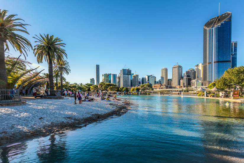 Im Südwesten vom Central Business District findet ihr die Southbank Parklands. Dabei handelt es sich um eine erholsame Parkanlage, welche sich auf dem ehemaligen Gelände der Expo befindet und zu ausgiebigen Spaziergängen einlädt. Besucht ihr die Southbank Parklands, solltet ihr nicht nur ein kleines Picknick einpacken, sondern auch eure Badesachen nicht vergessen. Brisbane hat zwar keinen natürlichen Strand, doch hier könnt ihr euch trotzdem Abkühlung verschaffen, nämlich an einer Lagunenlandschaft mitten in der Stadt. Weißer Sand, glasklares Wasser und hohe Palmen – am künstlich angelegten Streets Beach bekommt ihr wirklich alles, was euer Urlaubsherz begehrt.